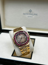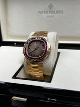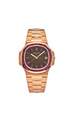 This Patek Philippe Nautilus is a special timepiece from the 'off the catalog' variants of Nautilus. It features a 40.5mm rose gold case with a rounded bezel elegantly set with rubies. The brown dial adorns ruby set hour markers and the watch comes on a rose gold bracelet.