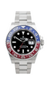 This model features a black dial and a two-colour Cerachrom bezel insert in red and blue ceramic. Designed to show the time in two different time zones simultaneously during intercontinental flights, the GMT-Master II has come to be recognized for its robustness and versatile appearance.