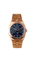The Vacheron Constantin Overseas Ultra-Thin Perpetual Calendar was introduced at SIHH 2016. It is powered by the automatic caliber 1120QP, which features a perpetual calendar. Reference 4300V/000R-B509 was added to the collection in 2019. It features an 18k rose gold case with a diameter of 41.5mm at a height of 8.1mm and a blue dial.